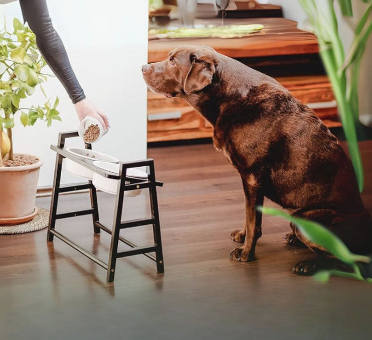 Unsere höhenverstellbare Napfbar kann einfach an die Bedürfnisse deines Hundes angepasst werden, um eine ergonomische Fütterung zu gewährleisten. Je nach Größe deines Hundes kannst du die Höhe des Napfhalters einstellen, sodass dein Hund in einer angenehmen Position fressen kann, was besonders bei älteren oder größeren Hunden gut für die Verdauung ist. Der Napf kann auf eine Futterhöhe von 10 cm, 20 cm oder 33 cm eingestellt werden.
