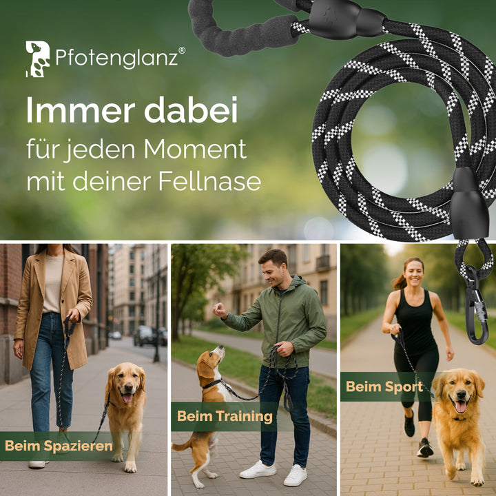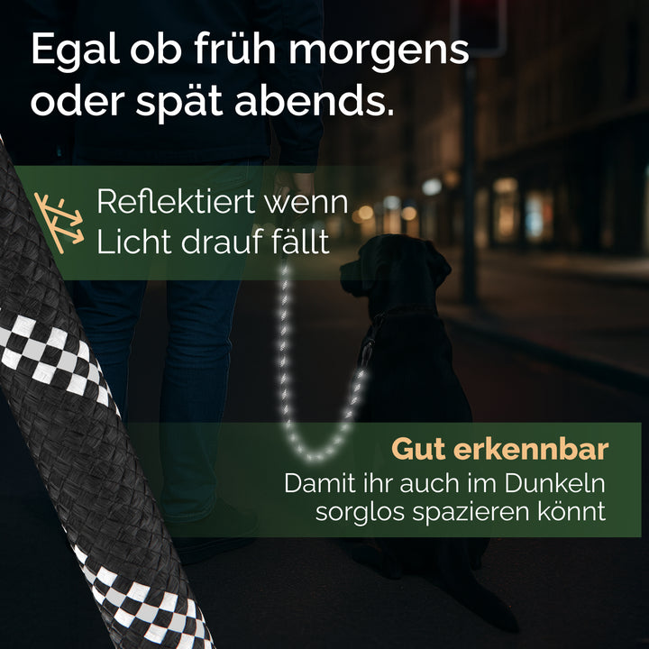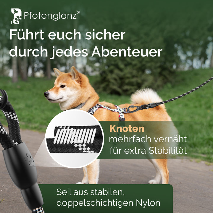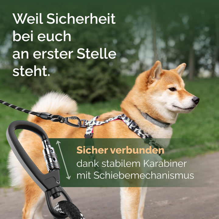 - Reflektierende Hundeleine: Mit reflektierenden Streifen sorgt die Seil Leine für bessere Sichtbarkeit im Dunkeln. Die Hundeleine mit Sicherheitskarabiner als Verschluss gewährleistet einen extra sicheren Halt
